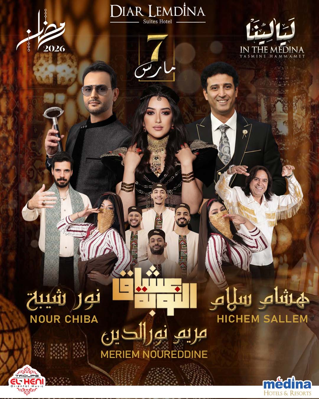 Médina Hotels & Resort organise une soirée artistique de qualité au niveau de la Médina pour animer le mois saint et ce le Samedi 07 Mars 2026 et le Samedi 14 Mars 2026 à Diar Lemdina 4*