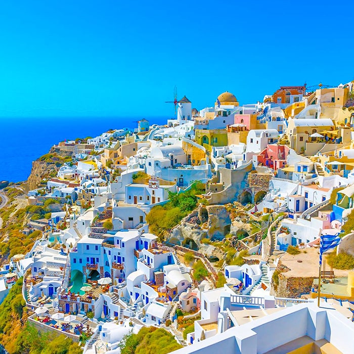 - Après le petit déjeuner, transfert au port de Mykonos pour prendre le ferry vers l'île de Santorini, Île emblématique des Cyclades.