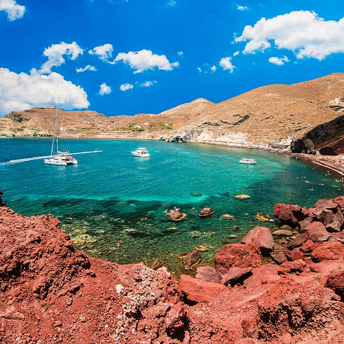 - Petit déjeuner à l’hôtel. Rendez-vous au point de départ du bus pour rejoindre la croisière vers la caldeira qui est un énorme cratère volcanique submergé par les eaux et entouré de falaises qui délimitent la baie de l’archipel de Santorin.