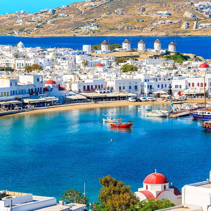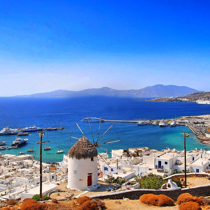- Journée libre à Mykonos. Telle une perle posée au milieu de la mer Égée, star invincible du tourisme et de la fête en Grèce, Mykonos est réputée pour ses nombreuses plages sublimes et son animation nocturne festive. L’île abrite des sites charmants et a réussi à préserver son identité historique grâce à ses maisons cubiques aux toits bleus flanquant les pittoresques ruelles et grâce à ses moulins à vent étincelants de blancheur…