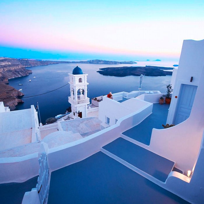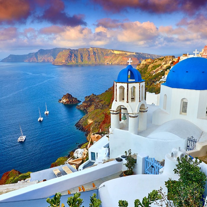 - L’arrivée en ferry dans la baie de Santorin nichée entre les falaises de pierre ponce rouge-brun est un spectacle qui enchante. Élégante par son origine volcanique, l’île est un joyau avec ses maisons blanches typiques des Cyclades, ses coupoles bleues, ses plages de sable noir bordées par des eaux cristallines, ses panoramas magnifiques et ses fameux couchés de soleil.